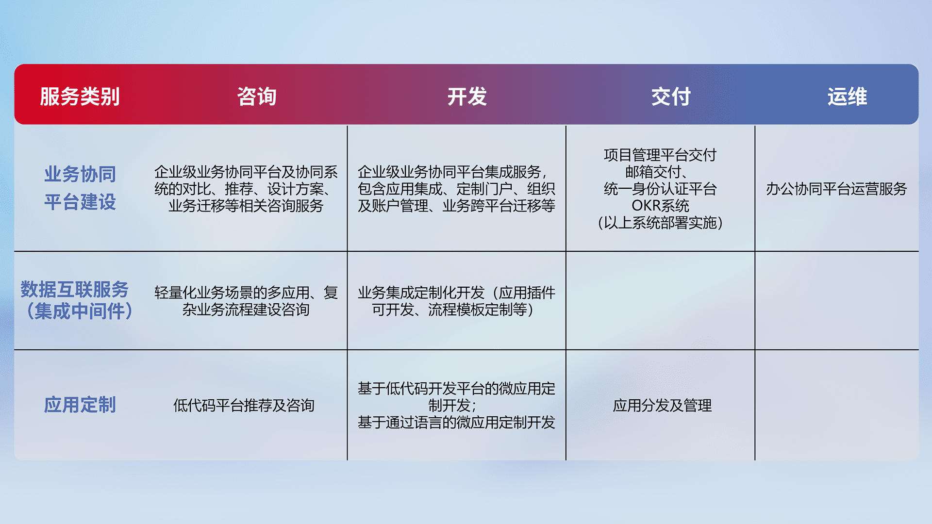 针对钉钉、、、企微、、、IDaas等平台级产品提供产品的规划、、、方案、、、、交付、、、定制化开发等服务,,实现如统一协同办公、、智能客户服务、、混合会议管理、、智能数据查询、、等业务场景,,实现数字化转型。。。