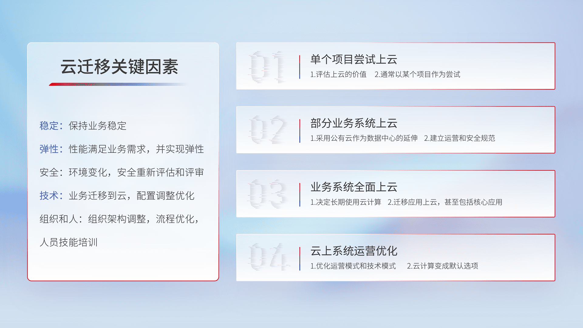 结合实际业务,,,从规划设计、、云平台选型、、、云原生改造、、数据迁移、、集成交付,,,迁移全过程为客户识别最佳上云路径,,做好风险识别管理,,,设计网络架构、、身份权限、、、、安全审计合规、、、、操作审计、、、、日志审计、、监控告警策略、、多站点容灾设计等,,,,对云上基础设施进行整体规划,,提升IT治理水平,,,,以满足弹性、、高可用、、、高性能的需求。。
