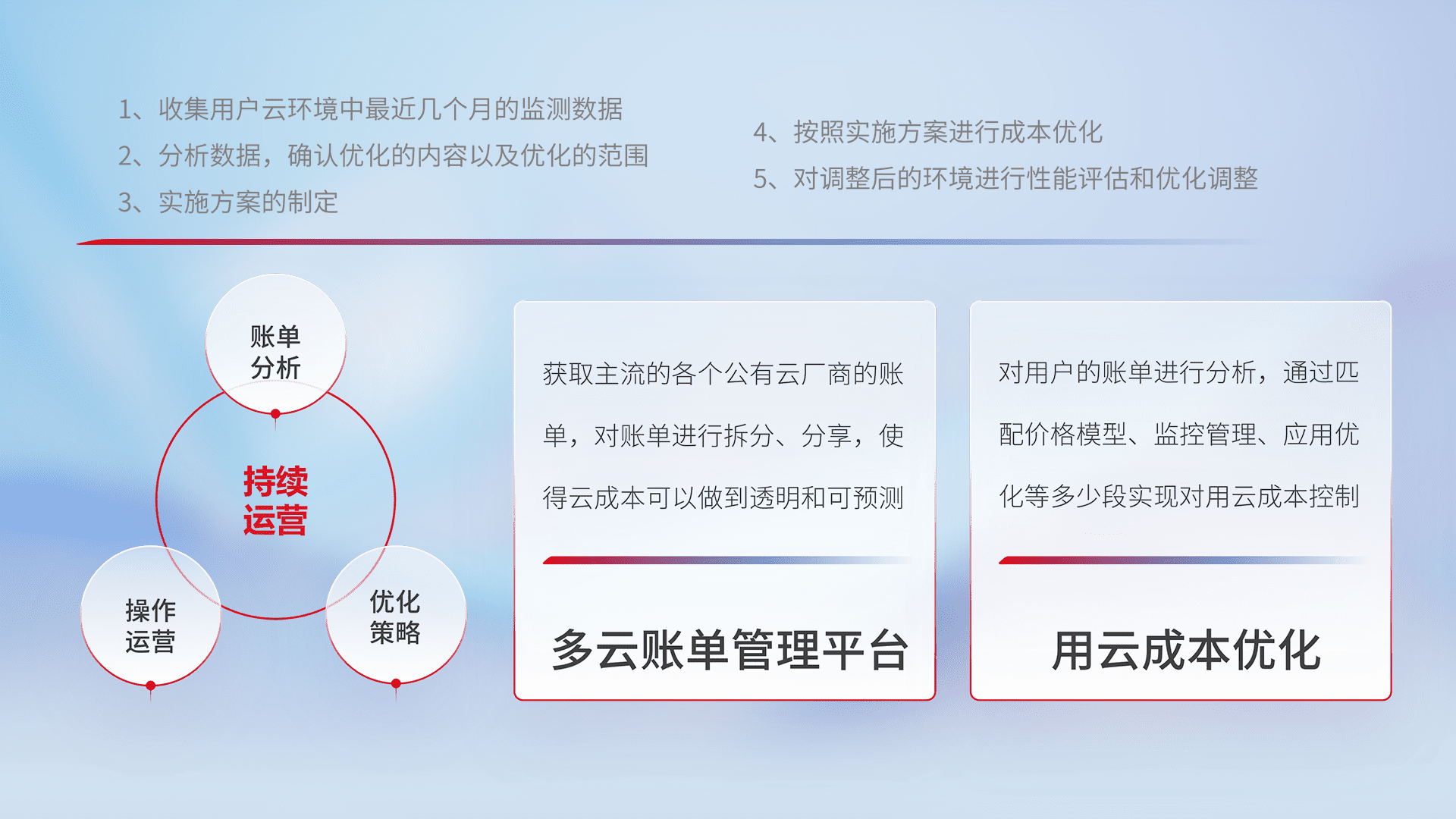 通过多云纳管,,以统一的资源数据模型把客户的云资源进行抽象和封装,,,进而实现对多云资源的统一操作,,,保障云资源管理的可靠性、、、、稳定性与可用性。。。量身定制化运维内容,,配置、、开发运维、、、、补丁管理、、、备份、、监控、、、认证和访问管理、、、、审计和日常巡检等,,,保障在用云过程中的可靠度,,,稳定度以及高可用率。。。